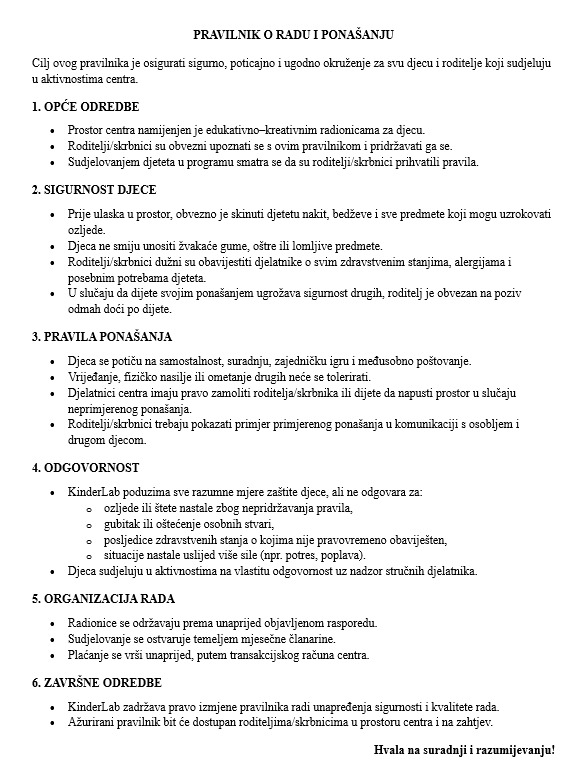 Naša misija je pružiti djeci sigurno, poticajno i radosno okruženje u kojem će učiti kroz igru, razvijati svoje potencijale i osjećati se viđeno, poštovano i voljeno. Kroz pažljivo osmišljene edukativne aktivnosti podržavamo cjeloviti razvoj djeteta – intelektualni, emocionalni, socijalni i motorički – uz puno topline, smijeha i razumijevanja.